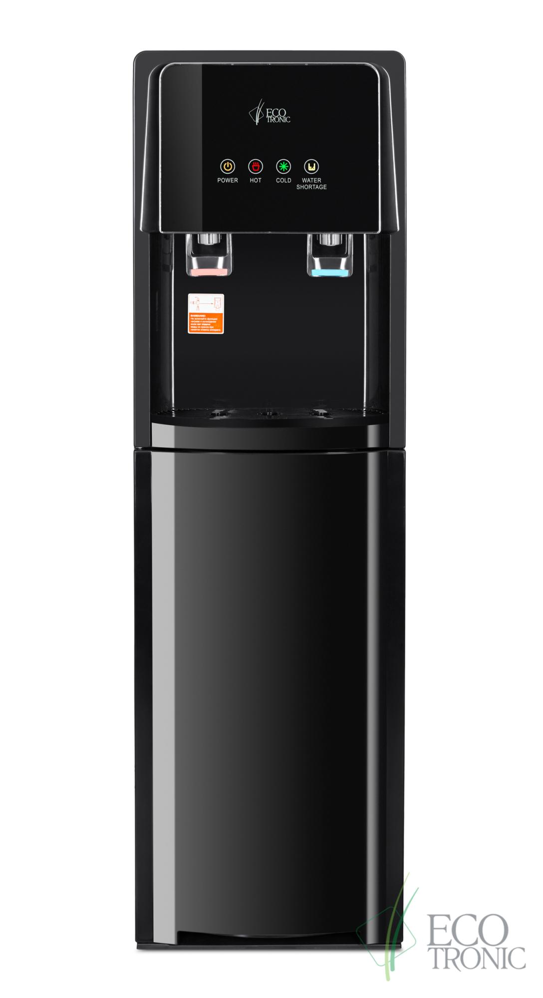 Напольный кулер с нижней загрузкой бутыли и электронным охлаждением. Краны «нажим кружкой». Корпус черного цвета с черной стеклянной вставкой на передней панели с индикаторами. Верхняя крышка с защитой от царапин. Индикация режимов нагрева и охлаждения воды, работы аппарата, индикатор пустой бутыли.