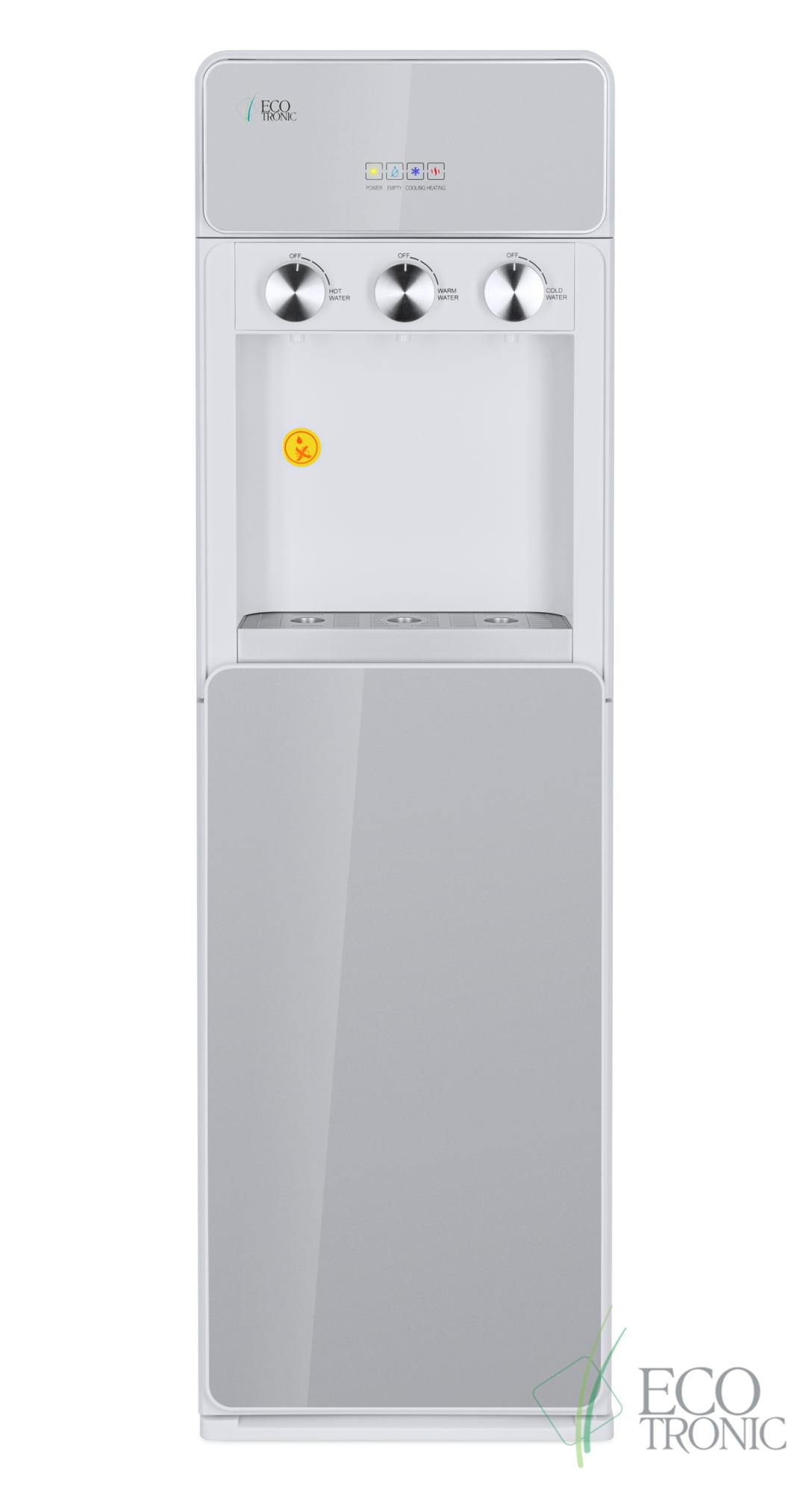 Напольный кулер с нижней загрузкой бутыли, поворотными кранами подачи воды и электронным охлаждением.