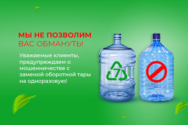 Мы, как организация, занимающаяся доставкой питьевой воды в бутылях объемом 19 литров, хотим предупредить вас о мошенничестве, которое может происходить с вашей тарой в других компаниях.Делая первый заказ воды 19 л вы покупаете поликарбонатную тару за 500 рублей. Эта бутыль является оборотной тарой.